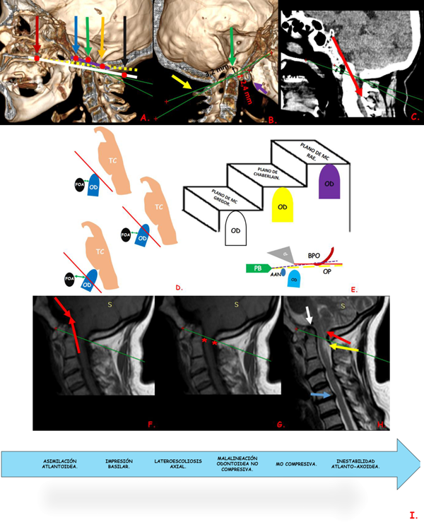 Fig. 1: 1A: Corte sagital de reconstrucción ósea tomográfica: en puntos rojos los reparos anatómicos, de adelante hacia atrás: flecha marrón, borde posterior del paladar (BPP); flecha azul extremo más inferior del clivus; flecha verde, ápex del odontoides; flecha anaranjada opistion; flecha negra parte más baja de la escama del occipital; línea blanca, el plano de Mc Gregor; línea amarilla punteada plano de Chamberlain; línea purpura, plano de Mc Rae. Fig 1B: Mismo corte, hallazgos de la asimilación atlantoidea; flecha púrpura, arco anterior vestigial; flecha verde ápex odontoide; flecha amarilla apófisis espinosa de C2, ausencia de arco posterior de C1 (Zona 3 de fusión); líneas verdes plano de Mc Gregor y Plano de Mc Rae. En rojo, medición espacio atlanto axial menor de 3mm que significa que no existe inestabilidad, y en negro distancia de invaginación basilar menor de 10 mm. Fig. 1C: Corte sagital de tomografía simple de cráneo, línea roja plano de Wackenheim, con ligera retroversión odontoidea, líneas verdes plano de Mc Gregor y plano de Mc Rae. Fig. 1D: Evolución de la mala alineación odontoidea hasta llegar a la inestabilidad atlanto-axial, TC: Tronco encefálico, OD: odontoides, FOA: fusión occipito-atlantoidea anterior; línea roja -plano de Wackenheim- demuestra la mala alineación odontoidea; y línea verde -espacio atlanto-odontoideo- representa la inestabilidad atlanto-axial. Fig 1E: Escalón que indica los grados de impresión basilar de acuerdo al ascenso del odontoides en los planos. Abajo craneometría unión cráneo-cervical normal: PB: extremo más posterior del paladar blando, CL: clivus, AAN: Arco anterior del atlas, OD: odontoides, BPO: Borde posterior del agujero magno, OP: opistocraneon, línea amarilla punteada: línea de Mc Gregor (de PB a OP), línea roja, plano de Chamberlain (de PB a BPO), línea púrpura, plano de Mc Rae (de CL a BPO). Fig.1F: Corte sagital de resonancia magnética de columna (RMC), proyección T1, en línea roja ángulo ponto medular, no muestra “kicking”, línea verde plano de Mc Rae. Fig. 1G: RMC, en T1, corte sagital, en asteriscos rojos espacios libres de unión bulbo medular que muestra espacio canal raquídeo sin compresión, Fig. 1H: RMC en T2, corte sagital, flecha blanca, aparato cruciforme abombado con evidencia de hiperlaxitud; flecha roja, amígdalas cerebelosas, sin descenso; flecha amarilla, hiperintensidad en cordón posterior, puede ser confundido como “siringomielia externa” o quistes; flecha celeste, abombamiento del ligamento longitudinal posterior por protrusión discal que contacta la médula sin signos de mielopatía. Fig. 1I: Línea del tiempo de los eventos de la historia natural de la asimilación atlantoidea. (Fuente: Centro de imágenes del Hospital Eugenio Espejo, realizado por: autor JMAI).