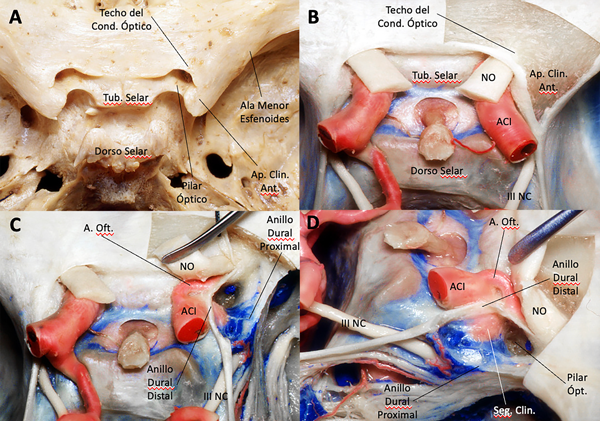 Figura 1. Anatomía quirúrgica de la región paraclinoidea. A: Vista superior de la anatomía ósea de la fosa anterior y media. B: Vista superior de la fosa anterior y media con sus estructuras neurovasculares; se evidencia la relación de la apófisis clinoides anterior y la carótida interna. C: Vista superior de la región paraselar, se evidencia la exposición del segmento clinoideo de la carótida interna posterior a una clinoidectomía total. D: Vista lateral del seno cavernoso. Se ha removido la apófisis clinoides anterior, se evidencia el segmento clinoideo de la carótida interna, la arteria oftálmica, también son visibles los nervios que discurren por la pared lateral del seno cavernoso y los anillos durales distal y proximal. Abreviaturas: Cond. (conducto), Tub. (tubérculo), Ap. (apófisis), ACI (arteria carótida interna), NO (nervio óptico), A.Oft. (arteria oftálmica), NC (nervio craneal)