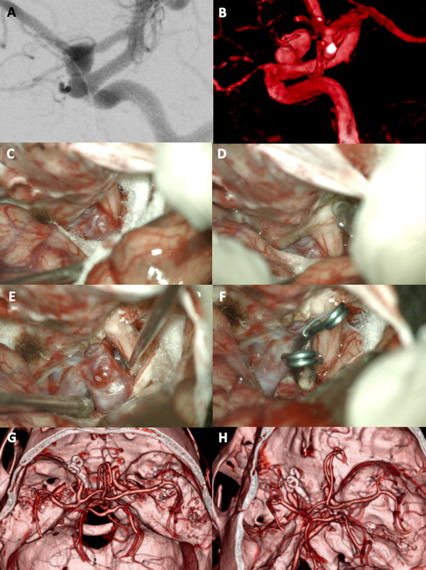 Figura 3. A-B: Se aprecia una arteriografía cerebral con reconstrucción tridimensional que evidencia un aneurisma carótido oftálmico izquierdo. C-F: Fotografías intraoperatorias; observamos la apertura de la fisura silviana con la presencia de la cisterna óptico-carotidea en la profundidad: es visible el saco aneurismático. Posteriormente se realizó un fresado del techo del canal óptico, con lo cual se logró una adecuada exposición del cuello del aneurisma. Se muestra la exclusión del aneurisma con dos clips semi curvos. G-H: Imágenes de angio tomografía post operatoria que evidencia la exclusión completa del aneurisma.