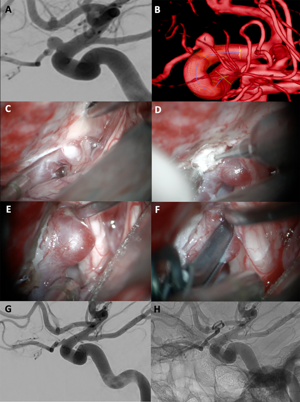 Figura 8. A-D: Se aprecian imágenes de arteriografía cerebral y reconstrucción tridimensional de la misma que evidencian un aneurisma carótido oftálmico derecho gigante. E-H: Fotografías intraoperatorias donde observamos la cisterna óptico-carotidea; es visible el saco aneurismático gigante, apenas visible el nervio óptico comprimido por el aneurisma. Dado el tamaño de la lesión se realiza una clinoidectomía anterior total y sección del anillo dural distal logrando una adecuada exposición del cuello del aneurisma. Se muestra la exclusión del aneurisma con múltiples clips quirúrgicos. G-H: Imágenes de arteriografía cerebral post operatoria con reconstrucción tridimensional que evidencian la exclusión completa del aneurisma.