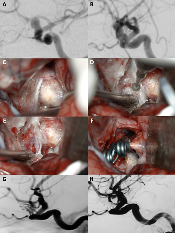 Figura 7. A-B: Se aprecia una arteriografía cerebral que evidencia un aneurisma carótido oftálmico izquierdo gigante. Es notoria la presencia de una ampolla (“bleb”) de gran tamaño. C-F: Fotografías intraoperatorias. Observamos la cisterna óptico-carotidea donde es visible el saco aneurismático. Dado el tamaño de la lesión se realiza una clinoidectomía anterior total y sección del anillo dural distal logrando una adecuada exposición del cuello del aneurisma. Se muestra la exclusión del aneurisma con múltiples clips. G-H: Imágenes de arteriografía cerebral post operatoria que evidencia la exclusión completa del aneurisma con preservación de la arteria oftálmica.