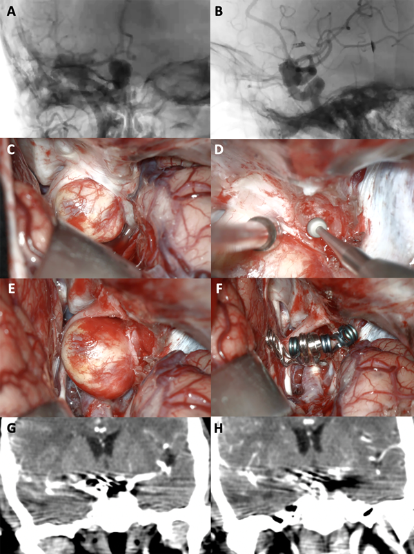 Figura 6. A-B: Se aprecia una arteriografía cerebral en vista AP y lateral que evidencia un aneurisma carótido oftálmico derecho gigante. C-F: Fotografías intraoperatorias. Observamos la cisterna óptico-carotidea; es notorio el gran efecto de masa del saco aneurismático sobre el nervio óptico. Posteriormente se realizó una clinoidectomía anterior total y sección del anillo dural distal logrando una adecuada exposición del cuello del aneurisma. Se muestra la exclusión del aneurisma con una técnica de reconstrucción vascular con múltiples clips. G-H: Imágenes de angio tomografía post operatoria que evidencia la exclusión completa del aneurisma, sin complicaciones asociadas.