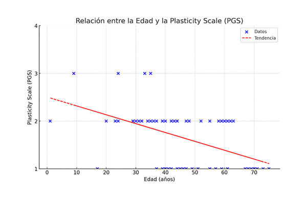 Resultados: 29 pacientes obtuvieron un PGS de 1; 37, un PGS de 2; 4, un PGS de 3 y ninguno alcanzó un PGS de 4. Se observó una relación negativa significativa (p <0.01) entre la edad y la plasticidad cerebral, lo que implica que, a mayor edad, menor plasticidad. También se encontró una relación positiva significativa (p <0.05) entre la calidad/frecuencia de la rehabilitación motora y la plasticidad cerebral, sugiriendo que una mejor rehabilitación se asocia con mayor plasticidad.
