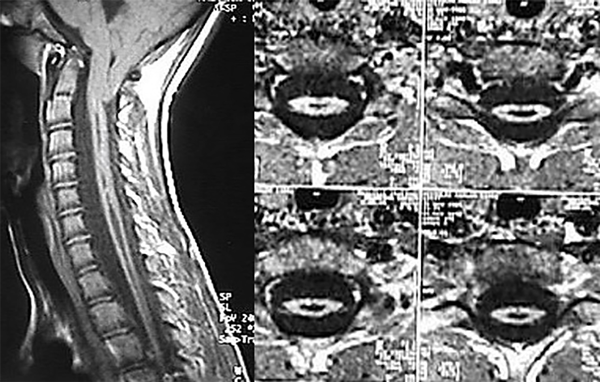 Figura 1. Cortes sagital y axiales en los que se observa extensa dilatación siringomiélica. Espinograma, frente.