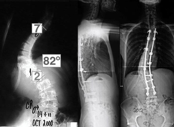 Figura 3. Espinograma, frente. Progresión curva de Cobb y su corrección mediante instrumentación toraco-lumbar.
