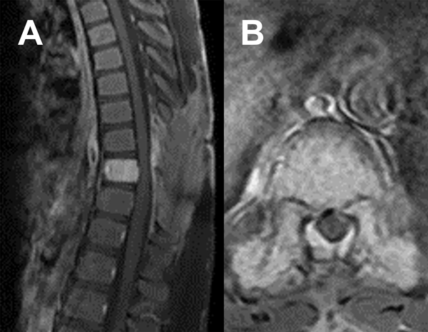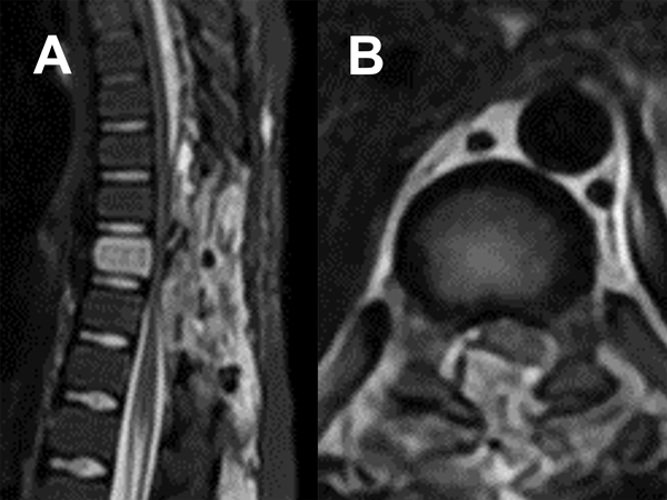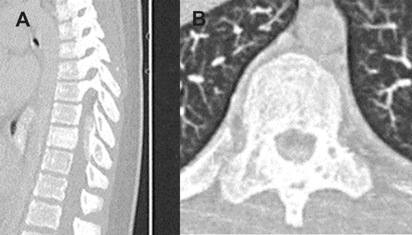Paciente masculino de 11 años hospitalizado por dorsalgia, paraparesia progresiva severa y retención urinaria. La tomografía computada (TC) y las imágenes de resonancia magnética (RM) revelaron una lesión a nivel D8 y D9, (Figuras 1 y 2). Debido a la rápida progresión de los síntomas se indicó tratamiento quirúrgico al quinto día de internación.