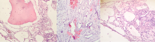 Figura 4. Imágenes de anatomía patológica. Coloración hematoxilina-eosina. Magnificación 10x y 4x. Microscopía: tejido óseo trabecular maduro en cuyos espacios medulares se observa una proliferación vascular benigna, constituida por vasos de pequeño a mediano tamaño, algunos dilatados, revestidos por endotelio sin atipias, con hematíes endoluminales que asientan sobre estroma fibrovascular con hemorragia reciente.