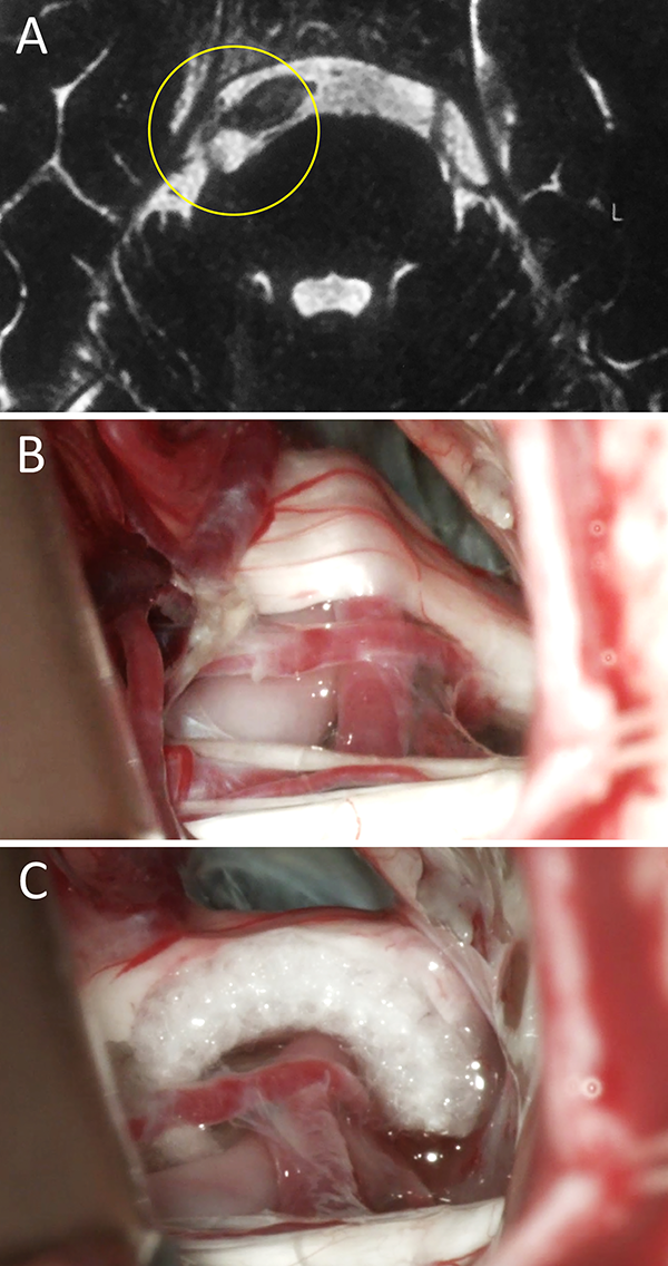 Figura 4: Mujer de 45 años de edad que presenta clínica de NT atípica refractaria a múltiples terapéuticas. En RM no se objetivo CNV. Ante persistencia del cuadro y el paciente expresó la voluntad de someterse a tratamiento quirúrgico. Se decidió DNV; durante la cirugía no se evidencio CNV alguno y se realizó neuropraxia. El paciente evolucionó con mejoría clínica. A) RM preoperatoria; B) hallazgo intraoperatorio; C) neuropraxia. NT: neuralgia trigeminal; RM: resonancia magnética; CNV: conflicto neurovascular; DNV: descompresiva neurovascular.