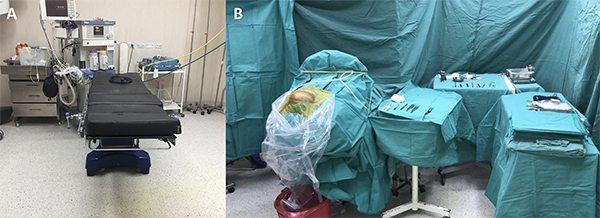 Figura 1: Organización del quirófano. A) Disposición del quirófano. B) Disposición de quirófano con campos estériles y mesa de instrumentación.