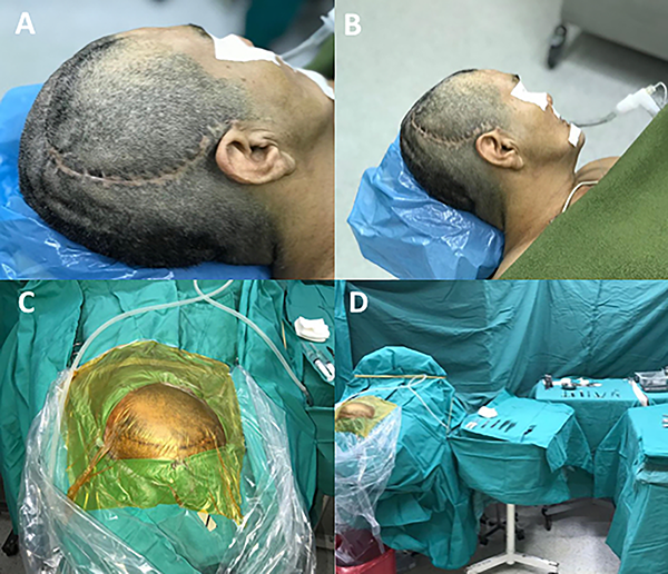 Figura 2: Posición, antisepsia y campos estériles. A-B) Tricotomía y antisepsia de piel. C) colocación de campos estériles vista sobre el cráneo con bolsa y iban. D: Visión ampliada de campos estériles con mesa de instrumentación.