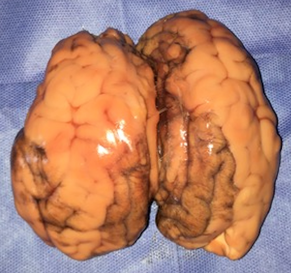 Figura 1: Cerebro bovino completo. La imagen muestra la conformación de un cerebro bovino completo, podemos apreciar la similitud con el cerebro humano en cuanto a su superficie externa.