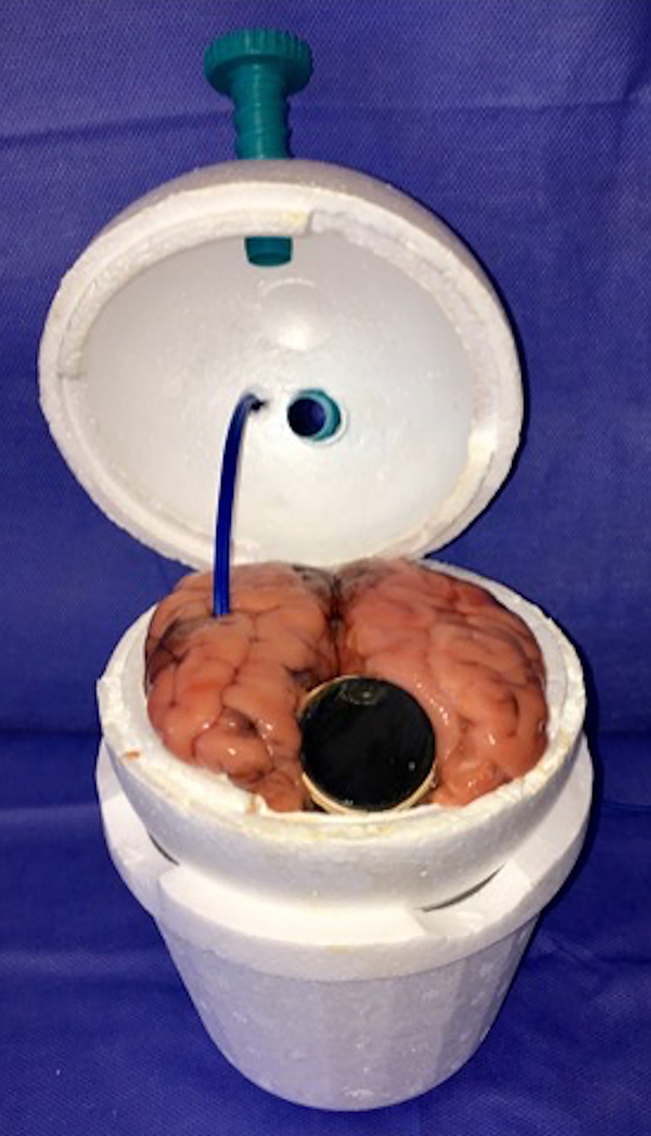El modelo consiste en la utilización de un cerebro bovino (de preferencia utilizar la pieza completa) (fig. 1) y de pequeñas unidades de membrana amniótica, que se colocan envolviendo las tapas de botellas de plástico, para permitir la fenestración y dilatación de la misma (fig. 2 a-b). Éstas se disponen dentro de un recipiente esférico de poliestireno expandido (fig. 3 a-b), el cual se fenestra en la parte superior para permitir el ingreso del endoscopio. Para poder utilizar el monopolar debe colocarse dentro del recipiente el terminal del cable, que proviene de la consola, directamente en contacto con el tejido cerebral (fig. 4). Finalmente cerramos la esfera de poliestireno expandido y la llenamos por completo con solución fisiológica o agua corriente (fig. 5).