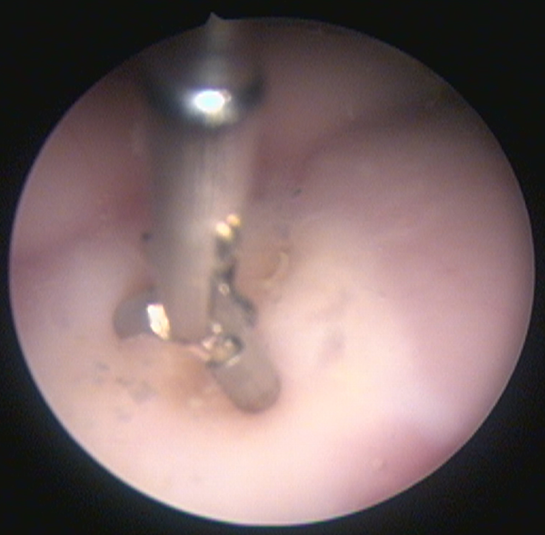 Figura 7: Imagen endoscópica del ejercicio de fenestración de membrana que simula una tercer ventriculostomía endoscópica.