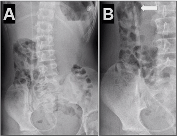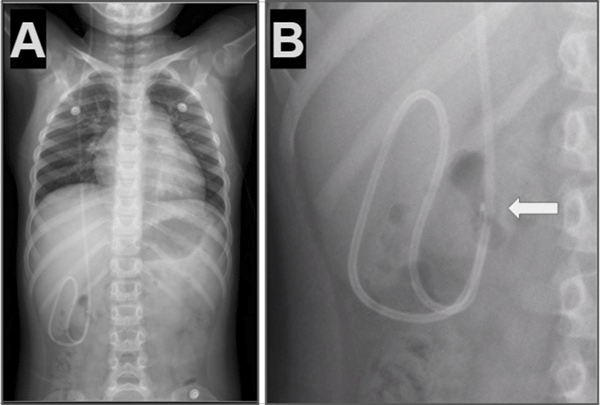 Figura 1. Caso 1: A) Se observa en Rx de tórax y abdomen (frente) catéter distal a nivel abdominal con migración retrógrada. B) Magnificación de Rx de abdomen que evidencia catéter en doble caño con signo radiológico del “caño de escopeta” o “signo del anzuelo” (flecha blanca).