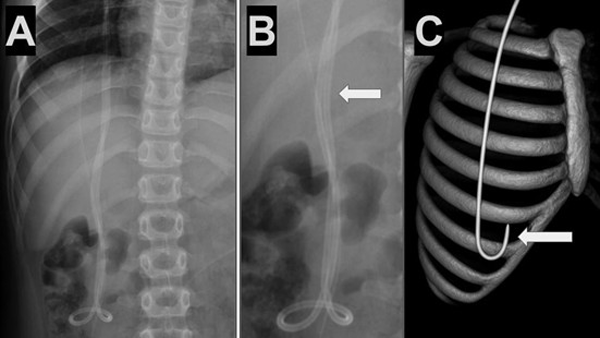 Una complicación rara y poco documentada es la migración retrógrada del catéter distal a través del tejido celular subcutáneo, generando imágenes características en estudios por imágenes, conocidas como signo de “caño de escopeta” o signo del “anzuelo”.(5,6) Esta configuración en espiral o enrollamiento del catéter ha sido asociada a diversos factores como adherencias peritoneales, aumento de la presión intraabdominal, o un trayecto subcutáneo anómalo.(7,8)