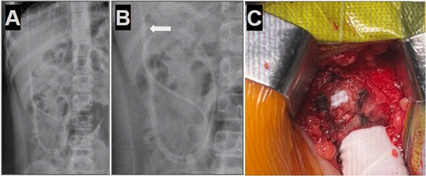 Figura 3. Caso 3: A) Se observa Rx de tórax y abdomen (frente) con catéter distal a nivel abdominal con migración retrógrada. B) Magnificación de Rx de abdomen que evidenció catéter en doble caño con signo radiológico del “caño de escopeta” o “signo del anzuelo” (flecha blanca) C) Imagen intraoperatoria que muestra la regresión del catéter en disposición paralela con la imagen típica de “doble caño” o “caño de escopeta”.