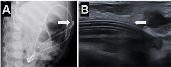 Figura 5. Caso 5: A) Se observa Rx de tórax y abdomen (perfil) con catéter distal a nivel abdominal con migración retrógrada. B) Ecografía abdominal: muestra ingreso y salida de catéter distal por mismo sitio; imagen típica de catéter en “doble caño” con signo ecográfico “caño de escopeta” (flecha blanca).