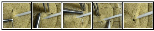 Figura 6. Se observa demostración de cierre de celiotomía con técnica de sutura “en bolsa de tabaco” realizada en modelo de simulación quirúrgica.
