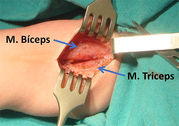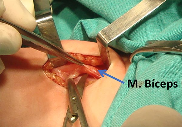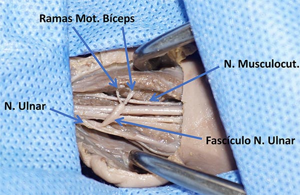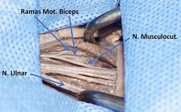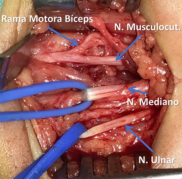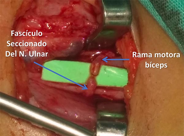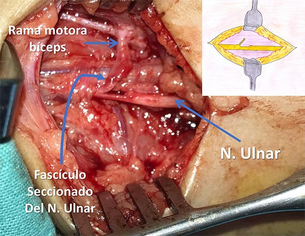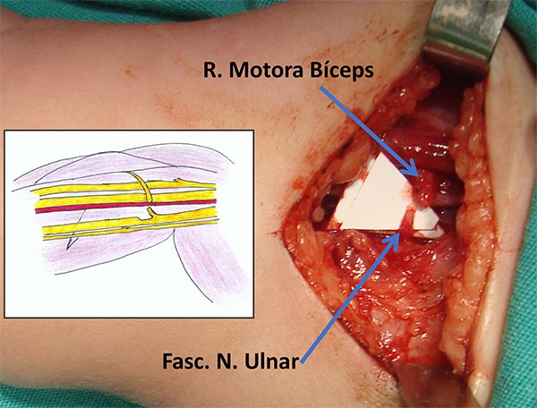 Descripción técnica: Paciente en decúbito dorsal, con el brazo afectado extendido, en supinación y abducción de 90°. Se incide piel 4cm de extensión en cara interna del brazo, hasta identificar la fascia braquial. Posteriormente se diseca la rama motora del bíceps y fascículos del ulnar. Mediante magnificación se aproximan los cabos y se realiza la neurorrafia.
