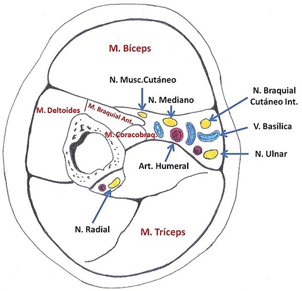 Figura 1: Dibujo de corte axial del brazo derecho a nivel de la cirugía de Oberlin.