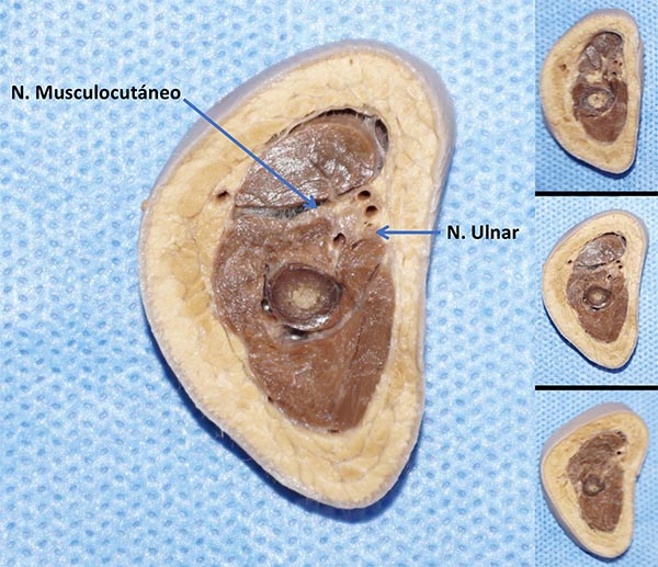 Figura 2: Corte axial de brazo derecho de preparado anatómico: A la izquierda: corte a nivel de la cirugía de Oberlin. A la derecha: cortes axiales a diferentes niveles del brazo.