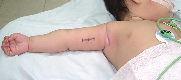 Una vez que ingresa el lactante a quirófano y luego de iniciada la anestesia general, el paciente se mantiene en decúbito dorsal con realce interescapular que impida flexiones cervicales de importancia, al poseer estos infantes una proporción céfalo/corporal diferente a la de los adultos. El miembro superior afectado debe situarse extendido, en supinación y abducción de 90° con respecto al tronco. El miembro se sitúa sobre una adaptación de la camilla quirúrgica destinada para tal fin, con pie de apoyo, de manera de minimizar las vibraciones en el tiempo microquirúrgico. La extremidad no debe inmovilizarse, es necesario mantenerla libre con el fin de poder observar los movimientos al realizar la estimulación intraoperatoria de los diferentes nervios (fig. 3).