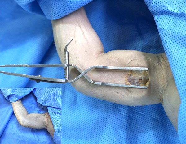 Luego de identificar el nervio ulnar, se procede a localizar los fascículos que inervan los músculos que participan en la flexión de la articulación radiocarpiana. El tamaño del fascículo nervioso dador debe tener las dimensiones similares al grosor de la rama motora del bíceps, que comprende aproximadamente un 10 a 20% del diámetro transversal del ulnar, siendo de elección los dispuestos en su cara anterolateral.26,29,35 Para realizar esto utilizamos un neuroestimulador con lápiz monopolar, el cual se calibra a una intensidad variable entre 1 a 5mA, y una frecuencia de 1 Hz. Se realizan potenciales evocados motores sobre el nervio, buscando objetivar la flexión de la mano sobre el antebrazo al estimular las fibras. Generalmente esta respuesta se obtiene al estimular sobre la cara anterolateral del nervio, como se manifestó anteriormente (fig. 13).