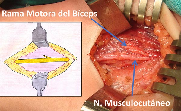Mediante maniobras de divulsión se diseca el plano existente entre el músculo bíceps braquial hacia superior y el músculo coracobraquial hacia inferior, ganando acceso al nervio musculocutáneo. Una vez identificado dicho nervio, se diseca hacia distal hasta identificar la rama motora que inerva al bíceps, y se procede a repararla (fig. 9).