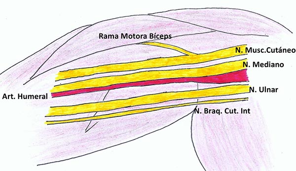Figura 20: Variación anatómica con dos ramas motoras para las diferentes porciones del músculo biceps (brazo izquierdo).