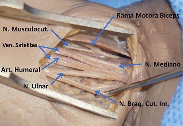 Figura 11: Disección anatómica de la distribución de los nervios internos (brazo derecho).