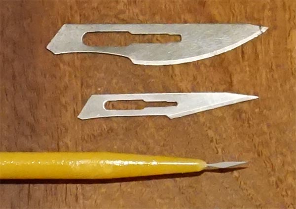 Figura 15: Microbisturí (inferior) utilizado para la epineurotomía, en comparación con hojas clásicas N° 11 (medio) y N° 24 (superior).