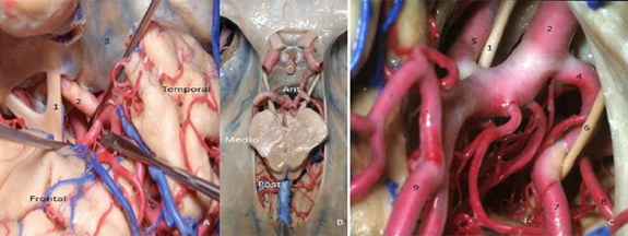 Se disecaron ocho cabezas de cadáveres utilizando un microscopio quirúrgico con un aumento de 3X a 40X. En los cerebros y en todas las cabezas se inyectó silicona de color para resaltar la diferencia entre las arterias y las venas. Los cadáveres se colocaron en un fijador de cráneo tipo Mayfield, con la cabeza extendida y girada, simulando el posicionamiento quirúrgico de los abordajes cráneo orbito-cigomático, petrosectomía anterior, posterior y retrosigmoideo.
