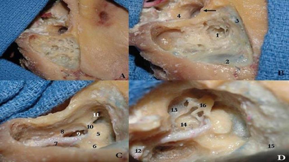 Figura 10: La mastoidectomía debe realizarse por etapas. El primer paso es el drenage de la porción cortical del mastoideo (A). El siguiente paso es identificar el antro mastoideo (1), que no es más que una celda aérea grande. En la profundidad del antro se identificará la cápsula óptica (canales semicirculares) de color amarillento. El antro mastoideo suele estar 5 mm posterior a la espina de henle (flecha), que se encuentra en la parte posterior y superior del conducto auditivo externo (B). El drenage delicado para la individualización de los canales semicirculares es importante porque el nervio facial estará anterior al canal semicircular lateral. El receso facial se encuentra entre la porción mastoidea del nervio facial y el nervio de la cuerda del tímpano y da acceso al promontorio. Es importante señalar que en el abordaje petroso posterior, no es necesario exponer el nervio facial, sino sólo la dira del triángulo trautmann. La laberintectomía (no mostrada aquí) consiste en el drenage de los canales semicirculares y en dar acceso al conducto auditivo interno (C). En esta última etapa, se drena la pared posterior del meato y se exponen los huesecillos del oído medio, así como el promontorio (D). 1. antro, 2. seno sigmoideo, 3. tegmen mastoideo (duramadre de la fosa media), 4. pared inferior del conducto auditivo externo, 5. canal semicircular lateral, 6. canal semicircular posterior, 7. porción mastoidea del nervio facial, 8. nervio de la cuerda del tímpano, 9. receso facial, 10. Buttress es un puente óseo artificial creado durante la mastoidectomía, 11. yunque, 12. bulbo yugular, 13. membrana timpánica, 14. promontorio, 15. ángulo de citelli, ubicado entre la duramadre en la fosa posterior y media, 16. huesecillos.