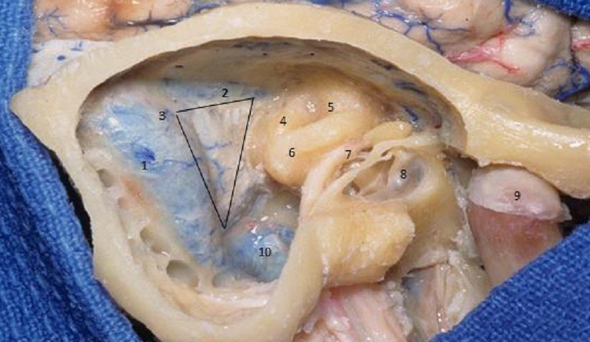 Figura 11: Mastoidectomía que muestra el triángulo del trautmann después de la extracción de las celdas aéreas en la mastoides. El espacio triangular está sobre la duramadre pre-sigmoidea. 1. seno sigmoideo, 2. seno petroso superior, 3. ángulo sinodural (de Citelli), 4. canal semicircular posterior, 5. canal semicircular superior, 6. canal semicircular lateral. 7. nervio facial, 8. membrana timpánica, 9. cóndilo mandibular, 10. bulbo yugular.