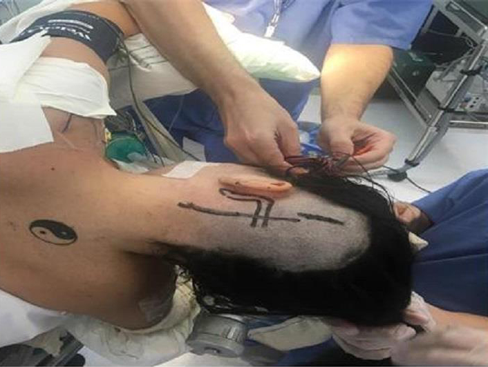 La craneotomía fronto-temporo-esfenoidal - pterional - descrita por Yasargil, en 1975,49 promueve la exposición del opérculo frontoparietal, la apertura de la fisura silviana y las cisternas anteriores en la base del cerebro. El paciente es colocado en decúbito dorsal con los hombros en el borde de la mesa de operaciones en posición neutral, y la cabeza y el cuello suspendidos después de retirar el soporte de cabeza. La cabeza es fijada en el cabezal de Mayfield y es mantenida por encima del nivel del atrio derecho para facilitar el retorno venoso. Las patologías en la región del seno cavernoso requieren una pequeña desviación y una mayor rotación de la cabeza, dejando el borde orbitario en el plano superior. La tricotomía debe realizarse hasta 2 cm distalmente de la región de la incisión quirúrgica, inmediatamente antes de la cirugía, permitiendo una mejor fijación de los campos, una reducción del riesgo de infección y una mejor fijación del apósito después del final del procedimiento. La incisión sigue una trayectoria arciforme desde el borde superior del arco cigomático inmediatamente anterior al trago, extendiéndose hasta la línea media del cráneo en la región frontal, respetando los límites de la implantación del cabello. La ubicación de la marca antes del trago no debe ser muy anterior para evitar cualquier sección de la arteria temporal superficial y del ramo frontal del nervio facial, que es anterior a esta arteria.(50) Después se realiza la disección interfascial de Yasargil, la sección y el desplazamiento del músculo temporal, y la craneotomía pterional para exponer el giro frontal inferior, parte del giro frontal medio, giro temporal superior y parte superior del giro temporal medio. Esto permite la separación microquirúrgica de los giros frontal inferior y temporal superior sin que haya compresión de ellos contra la cresta ósea. La trepanación se realiza en tres ubicaciones: la primera entre la línea temporal superior y la sutura fronto-cigomática del proceso orbital externo; la segunda sobre la porción más posterior de la línea temporal superior; y la tercera debe hacerse sobre la porción más inferior de la parte escamosa del hueso temporal, con drenaje del ala pequeña del esfenoides, internamente entre la primera y la tercera trepanación. La apertura dural toma la forma de una C, con una concavidad libre que mira hacia el techo orbital para la base esfenoidal ya driladas.51