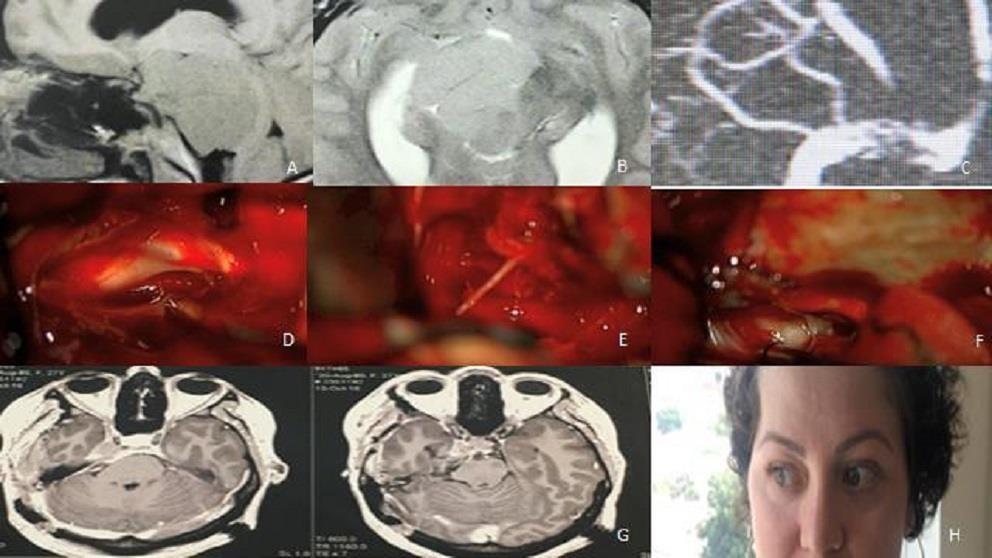 Figura 14: El abordaje petroso posterior está indicado para meningiomas petroclivales con inserción en el clivus medio y superior (A) y extensión en la fosa media (B). La venografía por resonancia magnética muestra el drenaje de la vena de Labbé en la unión de los senos transverso y sigmoideo (C). Imagen intraoperatoria del nervio oculomotor (D) y troclear (E) después de la resección del tumor. El facial está dentro del bloque óseo (*) y no necesita exponerse (F). Resonancia magnética con gadolinio postoperatorio (G y H). Paciente sin paresia postoperatoria de los nervios craneales (I).