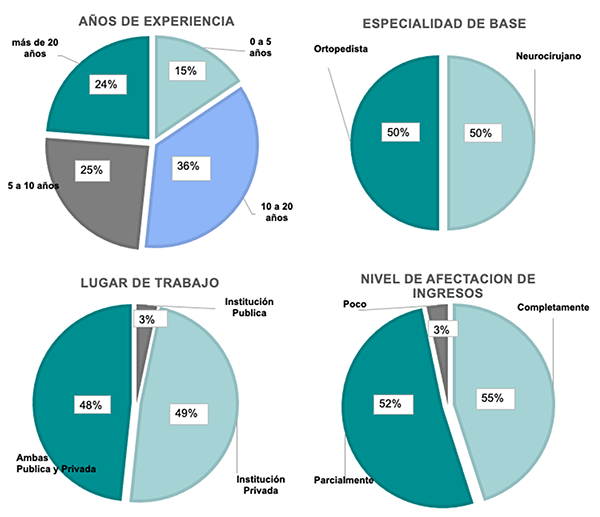 Conclusión: Se evaluó el impacto durante la pandemia por COVID-19 en la situación laboral y financiera de los cirujanos de columna encuestados. El impacto psicológico en el largo plazo debe ser considerado, para evitar secuelas en este grupo de profesionales de la salud.