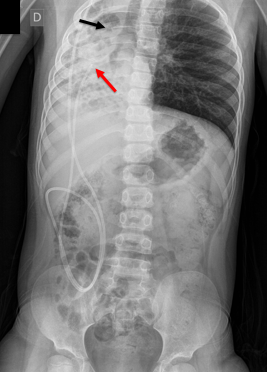 Figura 1: Radiografías de tórax y abdominal del Caso 1, que muestran un catéter distal migrado hacia el tórax (flecha roja) con un infiltrado pulmonar derecho y desplazamiento de la silueta cardíaca y las vías respiratorias (flecha negra).