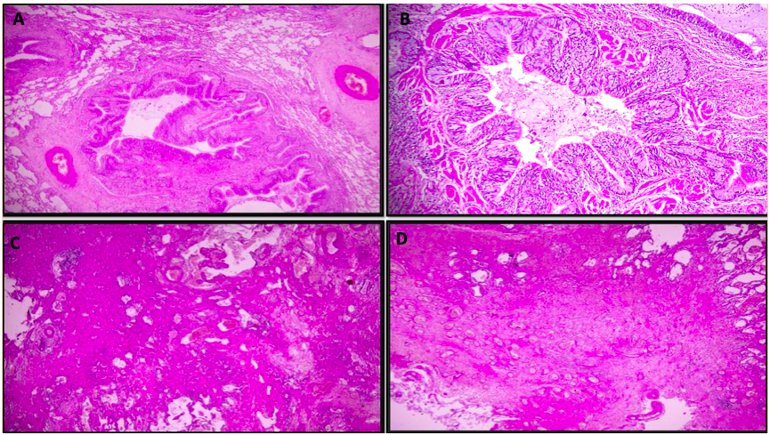Figura 3: Examen histológico de la resección pulmonar del Caso 1, que muestra dilatación anormal permanente y destrucción de los bronquios. Evidencia de infección crónica y fibrosis (A y C). Deterioro de la secreción bronquial (B) y derrame pleural (D).