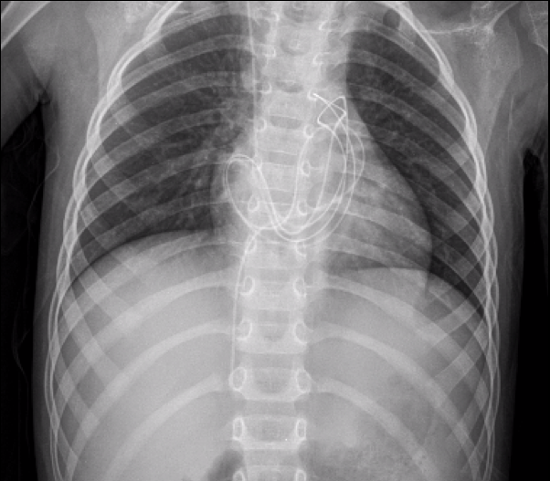 Paciente de 3 años, con antecedente de tumor de fosa posterior (TFP) e hidrocefalia, que debutó con síntomas de hipertensión endocraneana y ataxia de 3 semanas de evolución. Consultó a otra Institución, donde se colocó una DVP y se derivó a nuestro Hospital. Se realizó de forma programada resección del TFP sin complicaciones y con buena evolución. A los 5 meses de la colocación de la válvula, consultó por cefalea, náuseas y vómitos. Se estudió con Tomografía cerebral, que evidenció dilatación ventricular, y radiografías del sistema (Figura 4) que mostraron la ubicación intracardiaca del catéter distal. Se completaron los estudios con una tomografía de tórax (Figura 5) que informó la posición anómala del catéter distal, que se introducía en las cavidades cardiacas derechas, posteriormente en la arteria pulmonar, volviendo a las cavidades derechas e introduciéndose en la vena cava inferior con localización de la punta del catéter a nivel de la vena suprahepática derecha. No se observaron trombos relacionados con el catéter. Junto a los Servicios de Intervencionismo y Cirugía Cardiovascular se realizó la revisión valvular bajo monitoreo cardiológico continuo y radioscopia. A través de una incisión paralela a la válvula se retiró el catéter distal y se lo recolocó a la cavidad peritoneal. El paciente evolucionó favorablemente y fue dado de alta.