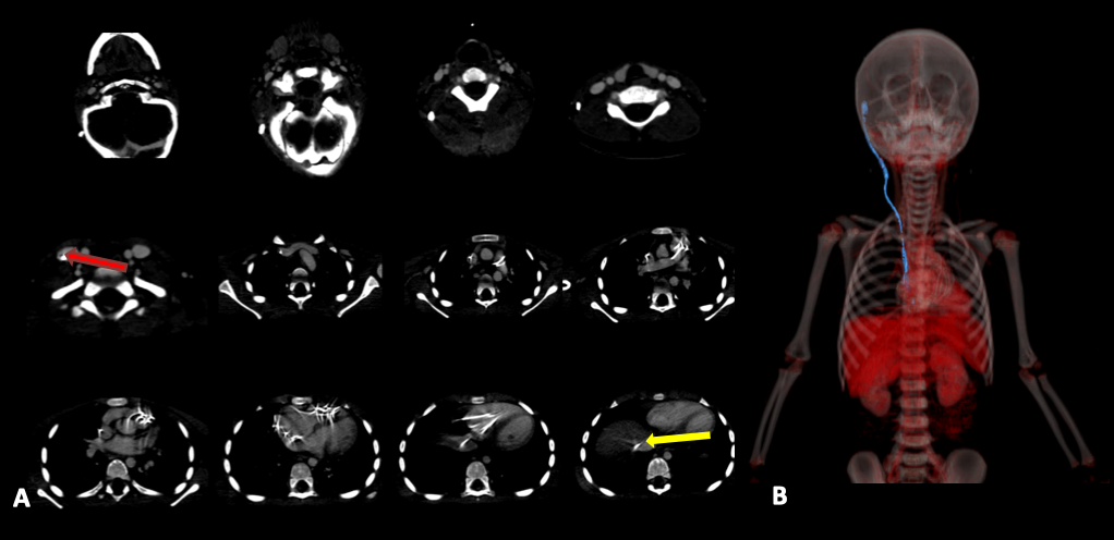 Figura 5: A) Tomografía computarizada de tórax del Caso 2. Se señala la posición anormal del catéter distal, que ingresa en las cavidades derechas a través de la vena yugular interna (flecha roja), alcanzando posteriormente la arteria pulmonar, para después volver a las dextro cavidades e introducirse en la vena cava inferior con localización de su extremo distal a nivel de la vena suprahepática derecha (flecha amarilla). B) Reconstrucción 3D del catéter distal ingresando al atrio derecho.