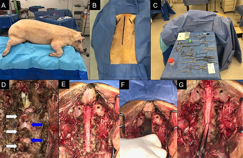 Laminectomía cervical posterior. A) Posición del porcino en decúbito ventral. B) Marcación de la incisión a nivel cervical posterior sobre línea media. C) Instrumental utilizado: Separadores autoestáticos, pinzas, bisturí, gubias, kerrison y monopolar. D) Exposición de las láminas cervicales (flechas blancas) luego de disecar el plano muscular. Se puede observar la duramadre en los espacios interlaminares (flechas azules) luego de resecar el ligamento amarillo. E) Exposición de la duramadre de la médula cervical luego de completada la laminectomía. F) Osteotomía de la lámina de C1. G) Exposición de la duramadre cervical a nivel C1 y C2.