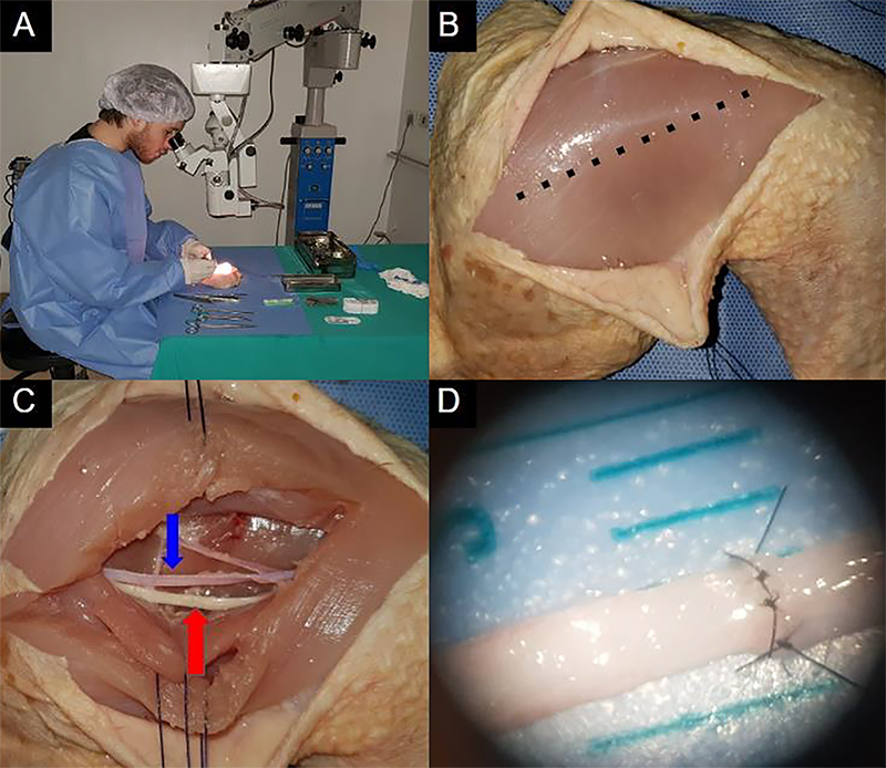 Figura 5: Disección pata de pollo. Anastomosis arterial en pata de pollo. A) Posición del residente en el microscopio. B) Pata de pollo luego de la incisión en la piel. La línea de puntos marca la incisión en el plano muscular. C) Apertura del plano muscular y exposición de la arteria (flecha azul) y del nervio (flecha roja). D) Anastomosis con puntos simples de prolene 9.0 del vaso arterial, de menos de 2 mm en este caso.