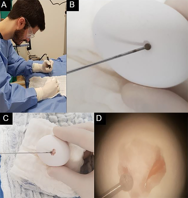 Figura 6: Drilado de cáscara de huevo. A) Posición del residente. B) Imagen macroscópica del drilado. C) Imagen macroscópica del drilado luego de la apertura de la cáscara. D) Imagen microscópica del drilado de la cáscara.