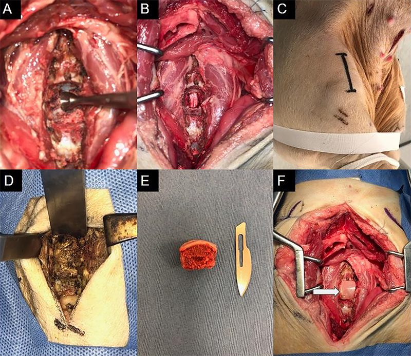 Figura 7: Corpectomía cervical anterior. A) La cureta se encuentra en el espacio del cuerpo vertebral entre ambos discos resecados previamente (Figura 5. F). B) Corpectomía completa. C) Marcación del sitio de incisión en la pata trasera para extraer parte del fémur del porcino. D) Osteotomía en el fémur para extraer el injerto. E) Porción del fémur del porcino utilizado como injerto autólogo. Bisturí N° 20 utilizado para referenciar en tamaño del injerto. F) Injerto autólogo en posición (flecha), ocupando el lugar del cuerpo vertebral previamente resecado (Imagen B).