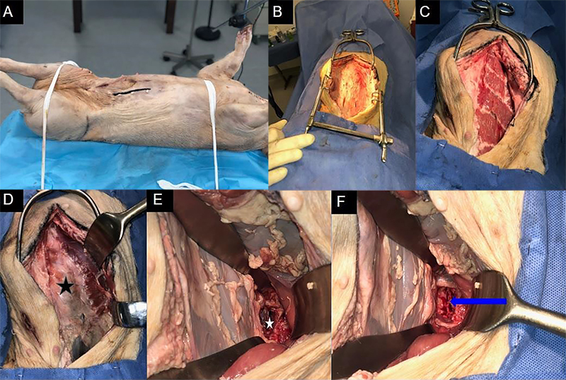 Figura 9: Microdiscectomía lumbar por vía anterior. A) Posición del cerdo en decúbito dorsal. B) Incisión paramediana izquierda y apertura del plano cutáneo. C) Apertura de la fascia y exposición del músculo recto del abdomen. D) Apertura del plano muscular y exposición del plano preperitoneal (estrella negra). E) Exposición de la cara anterior de la columna lumbar, luego de retraer las vísceras hacia la izquierda y el plano muscular hacia la derecha. F) Microdiscectomía lumbar anterior. Resección del disco intervertebral (flecha azul).