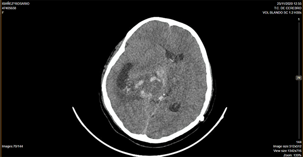 Imagen por Tomografía Cerebral computada donde se observa lesión ocupante de espacio intraventricular centroencefálica, con sangrado intratumoral y desvío de línea media.