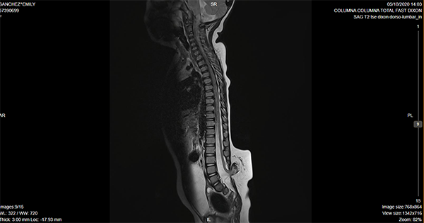 Imagen por Resonancia Magnética de columna lumbosacra donde se evidencia disrafismo lumbar, compatible con lipomielomeningocele.