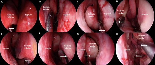 Figura 1. Fase nasal: tratamiento de los cornetes. A-D: fosa nasal derecha. A-B: lateralización de cornete inferior derecho. C-D: lateralización de cornete medio derecho. E-H: fosa nasal izquierda. E-F: lateralización de cornete inferior izquierdo. C-D: lateralización de cornete medio izquierdo.