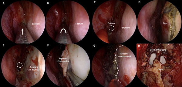 Figura 2. Fase naso-esfenoidal. A-B: identificación mediante palpación y apertura con maniobra rotacional del ostium esfenoidal. C-D: tallado del mini-rescue flap. E-F: septum denudado y desinserción osteo-cartilaginosa. G: exposición de mucosa contralateral luego de septectomía posterior; en línea de puntos se delimita el sitio de corte. H: rostro de oso hormiguero luego de exponer el rostrum esfenoidal.